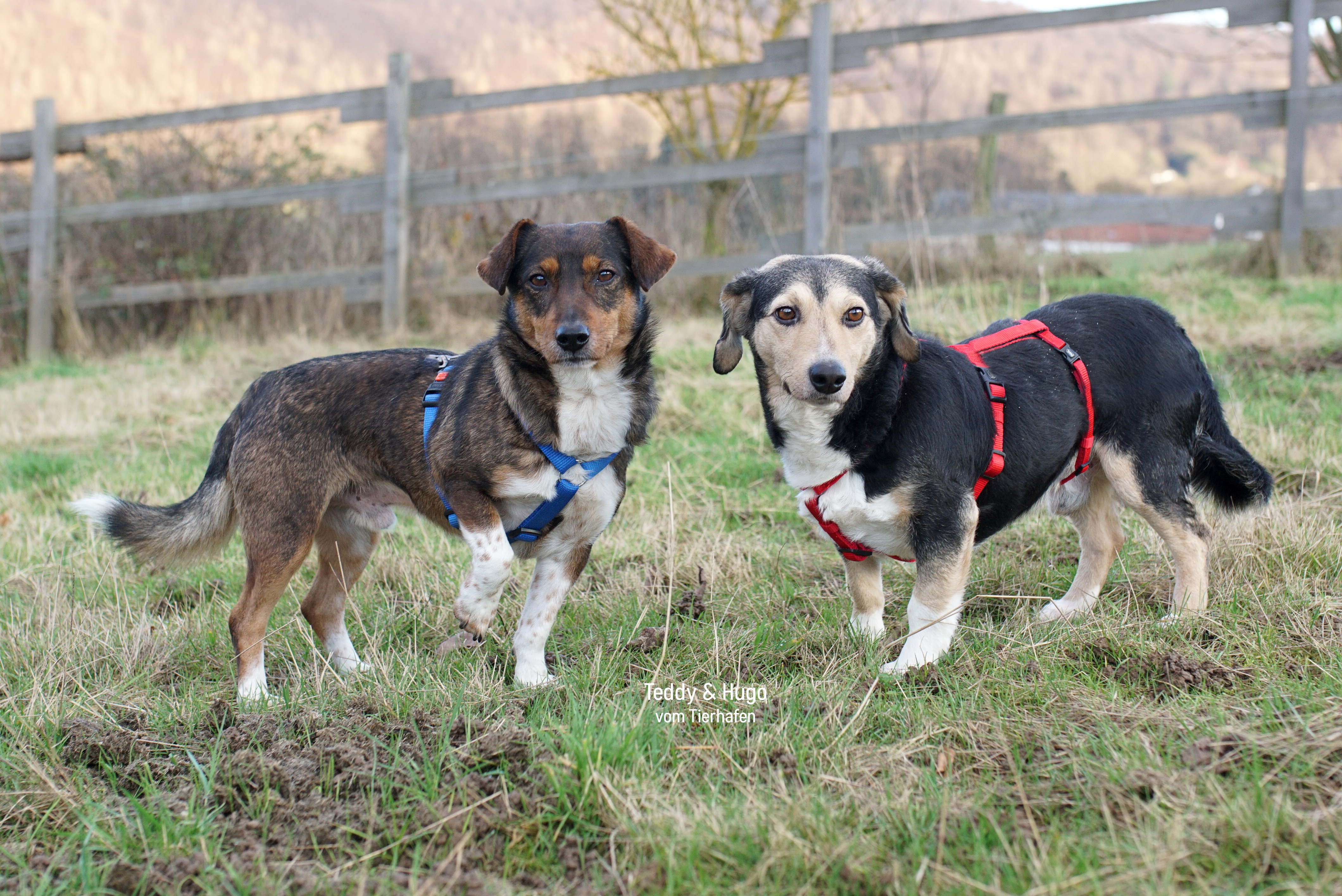 Hugo ist Teil einer Bromanze. Seinen Kumpel Teddy hat er im ukrainischen Tierheim in Kharkiv kennen gelernt, nachdem er aus dem Kriegsgebiet gerettet wurde. Seitdem machen sich die beiden nicht nur die Wartezeit im Tierheim kurzweiliger, sondern geben sich auch immer wieder abwechselnd Sicherheit.