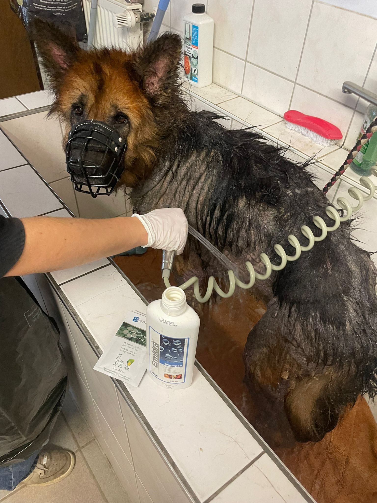 Durch das zuständige Veterinäramt war der Altdeutsche am selben Tag aus schlechter Haltung geholt und direkt zum Tierarzt gefahren worden. Die anschließende Unterbringung und Versorgung erfolgte dann bei uns im Tierhafen.