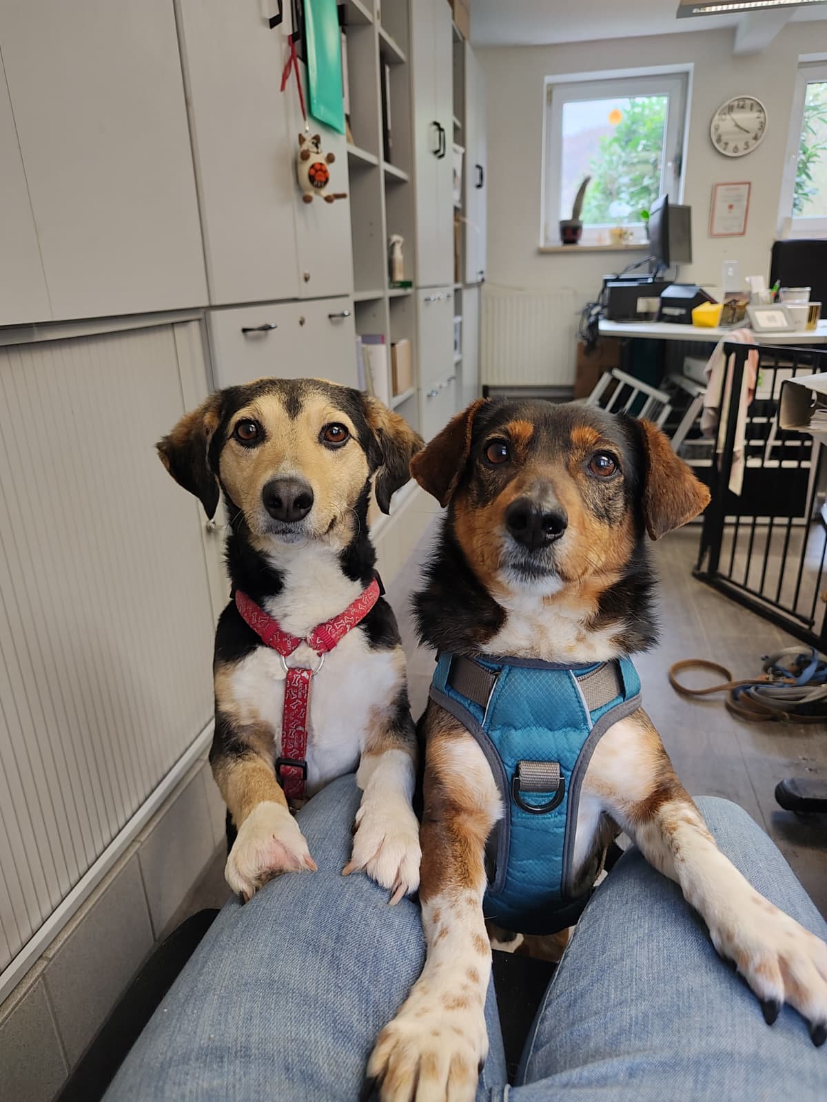 Beide Rüden sind stubenrein und lernen nicht nur bei ihrer Pflegemama zu Hause etwas mehr Alltag kennen, sondern helfen uns tagsüber auch bei der Ablage im Tierhafen-Büro.