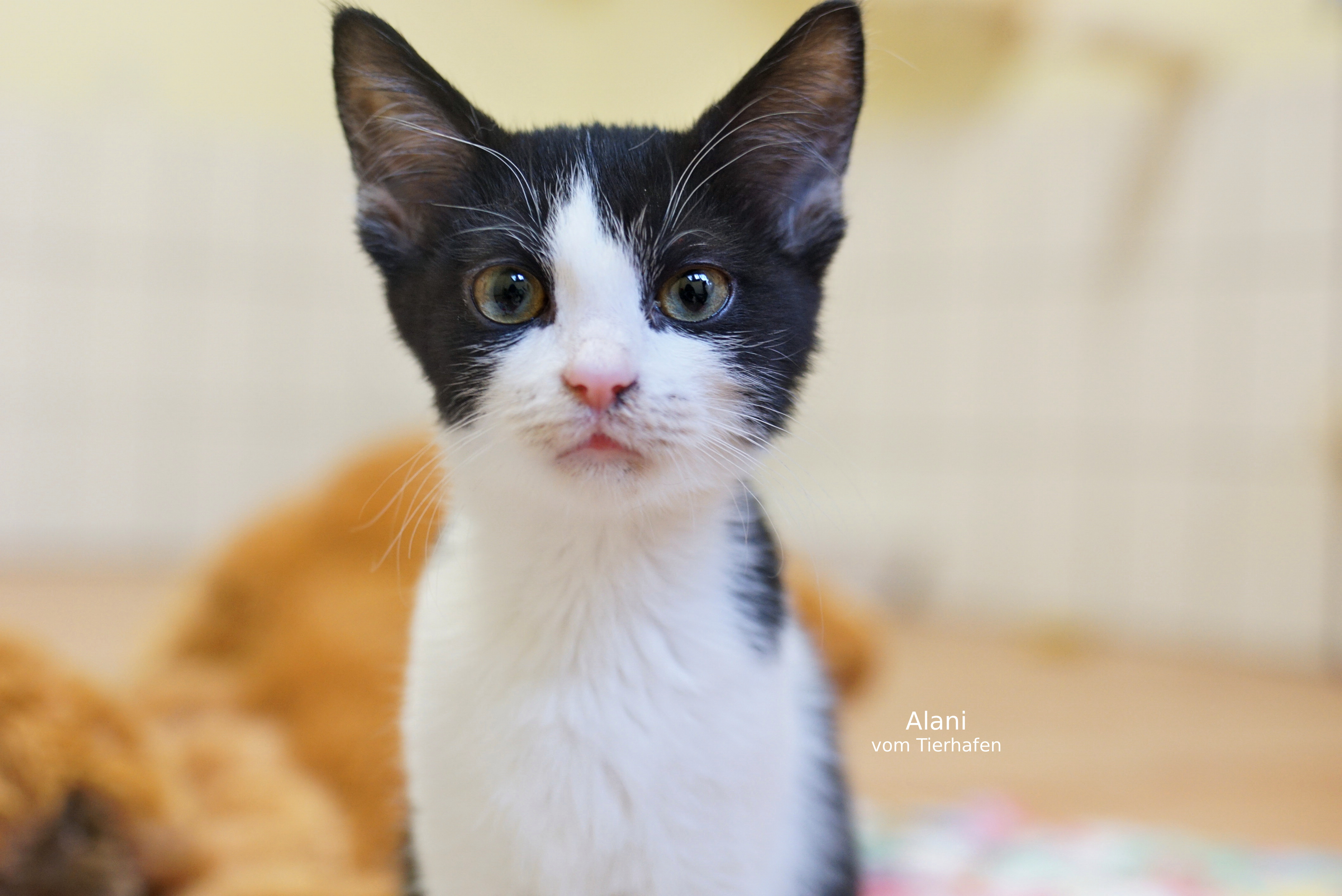 Alani ist die treibende Kraft des Duos und sucht schon recht entschlossen die Nähe von Besuchern. So beobachtet sie aus kurzer Distanz, wenn diese die anderen Kätzchen des Tierhafenkindergartens knuddeln und überlegt wohl, ob sich diese Art des Anbiederns auch für sie auszahlen würde.