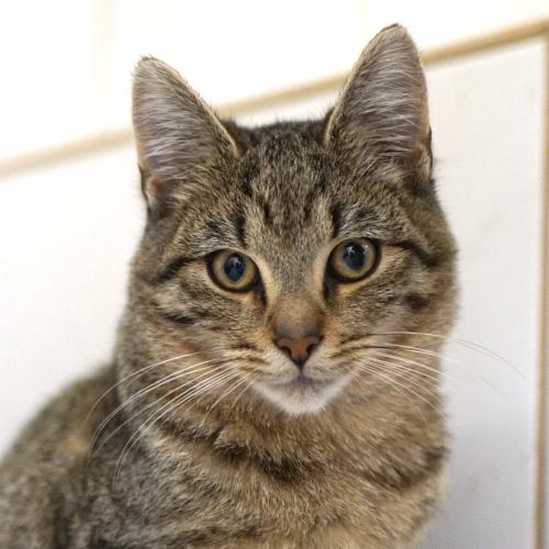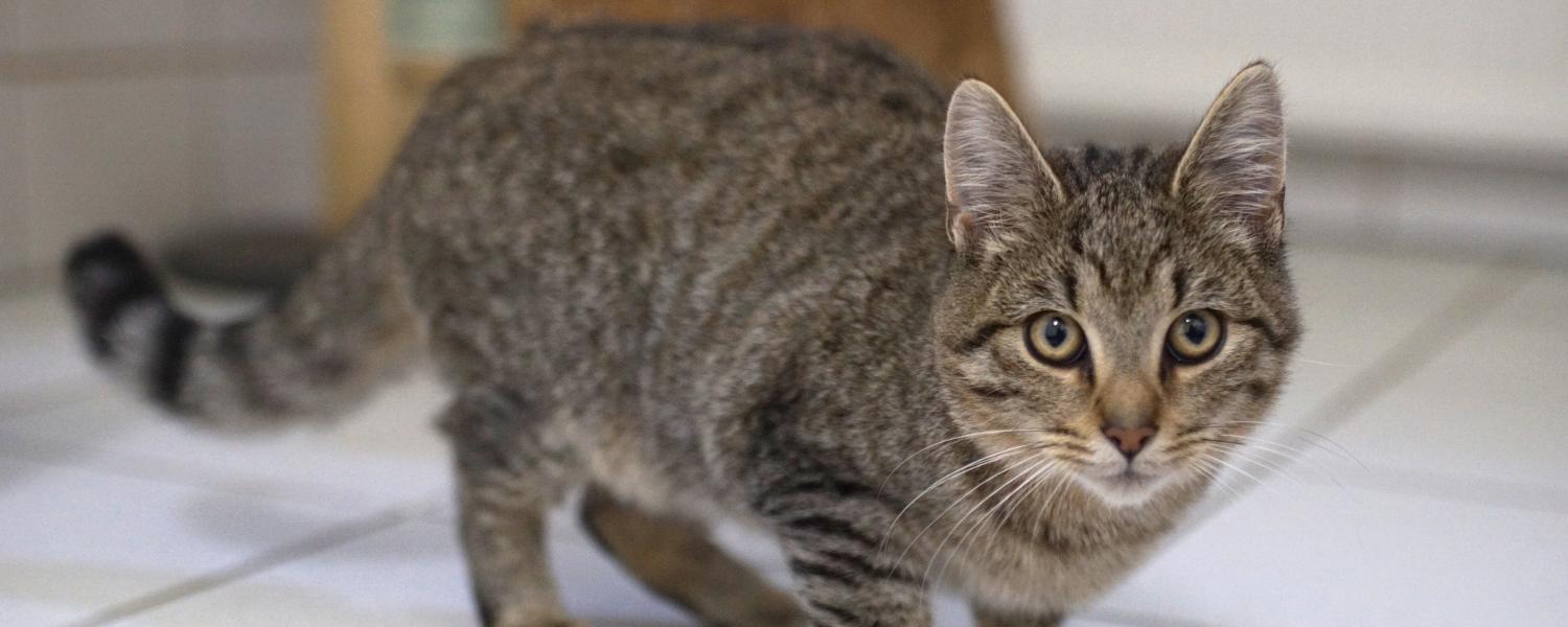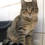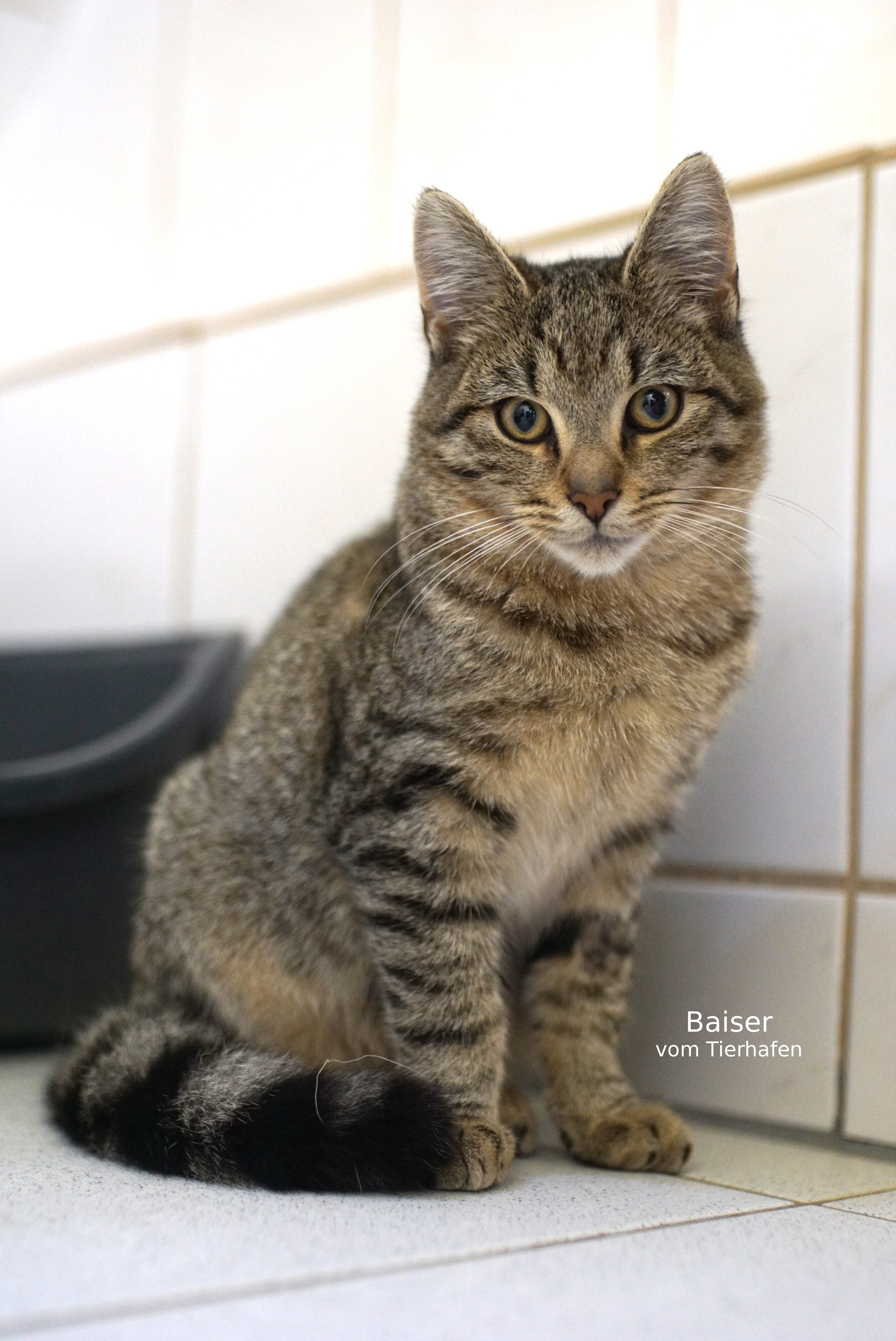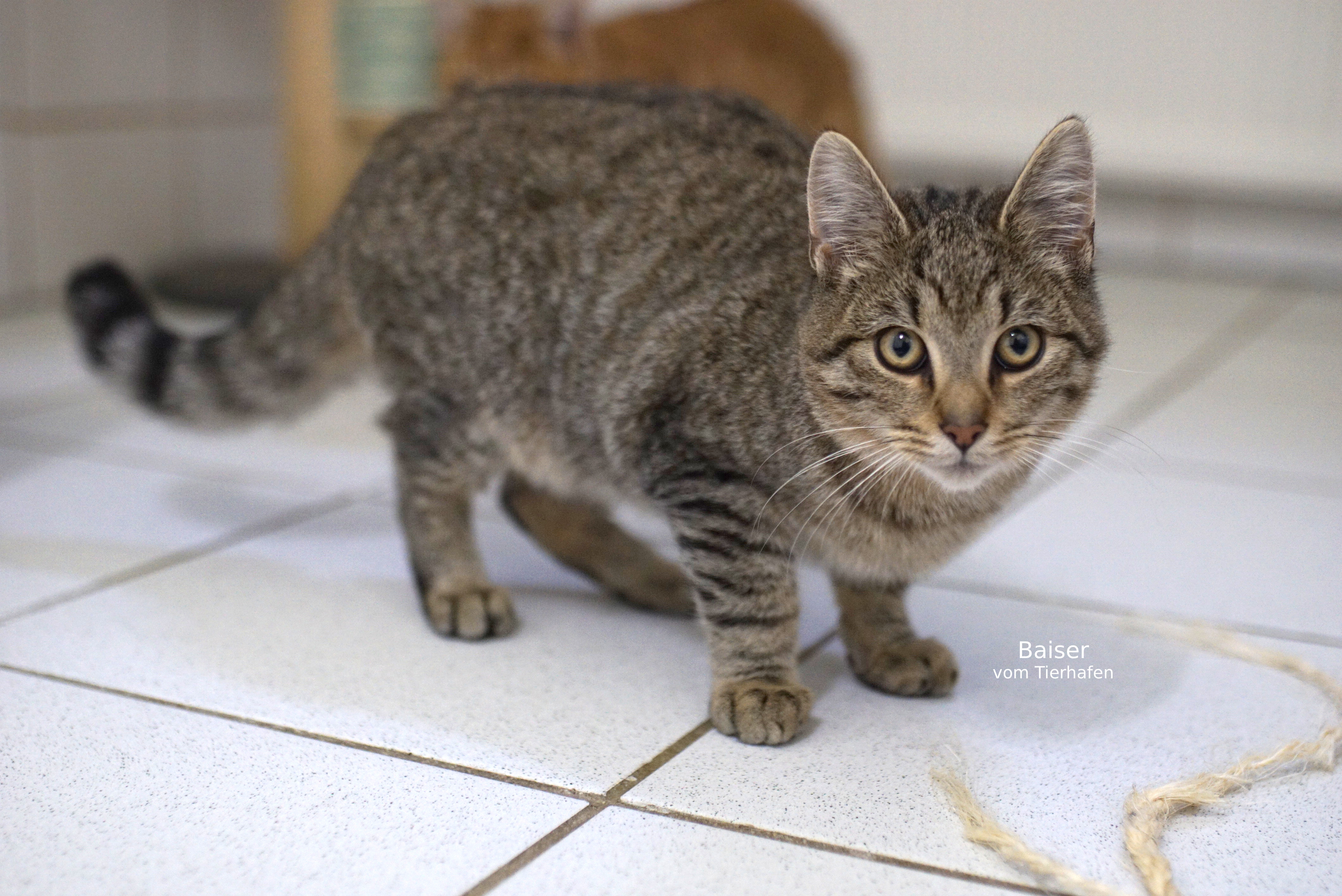 Mit seinem verhältnismäßig kurzen Puschelschwanz und der Tigerfärbung erinnert Katerchen Baiser an eine Mischung aus Haus- und Wildkatze. Tatsächlich wurde er halbwild geboren: Mama Hostie zog ihren Nachwuchs in einer Scheune im Borgentreicher Ortsteil Natzungen groß. Dort wurden sie von Anwohnern mit Futter versorgt, was die spätere Sicherung vereinfachte.
