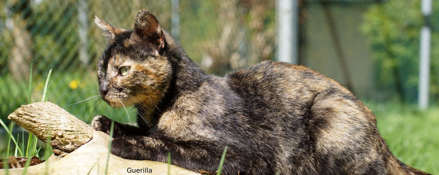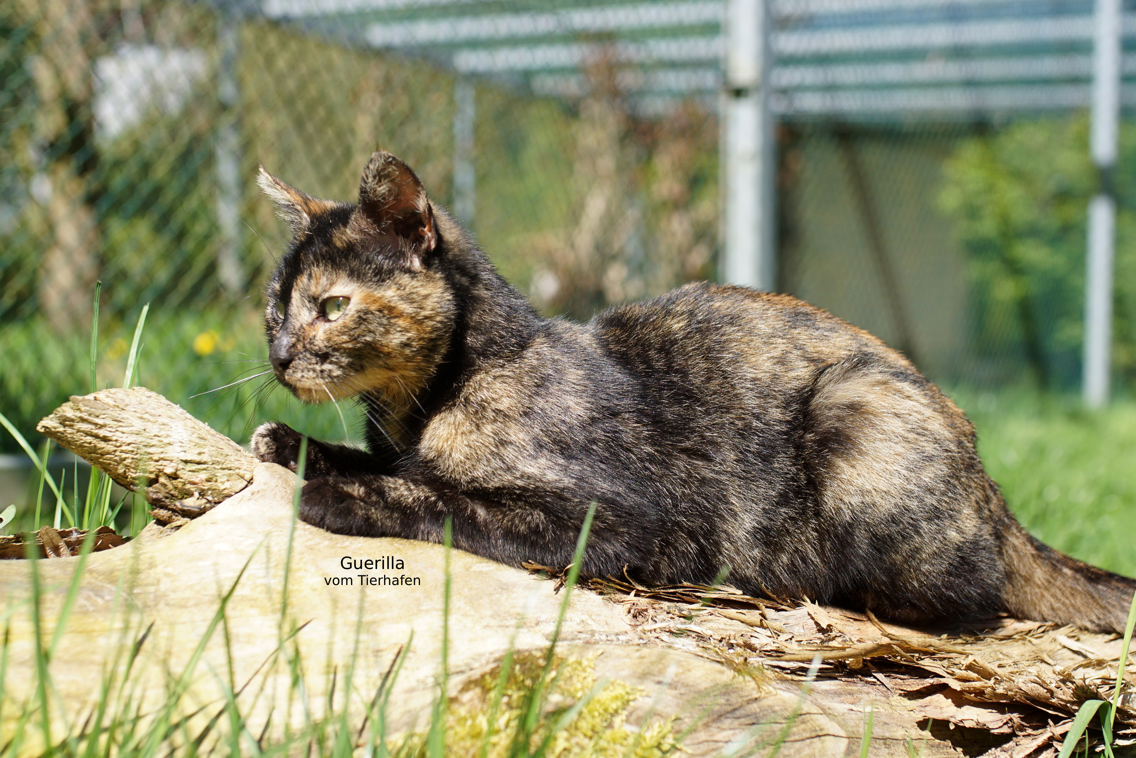 Zimmer und Auslauf teilt sie sich aktuell mit zwei weiteren Katzendamen, die von ihrer hektischen und vor allem am Futternapf bestimmenden Art etwas eingeschüchtert sind. Generell gehen wir aber eher davon aus, dass Guerilla in der Vergangenheit viel um den Erhalt wichtiger Ressourcen rangeln musste. In einem Zuhause, das ihr von Schlafplätzen, Spielzeug, Toiletten und Futter mehr als genug bieten kann, würde sie sich gewiss auch relaxter mit ihren Artgenossen zeigen. Freigang fänd sie klasse, ein gesicherter Balkon darf es aber auch gern sein.