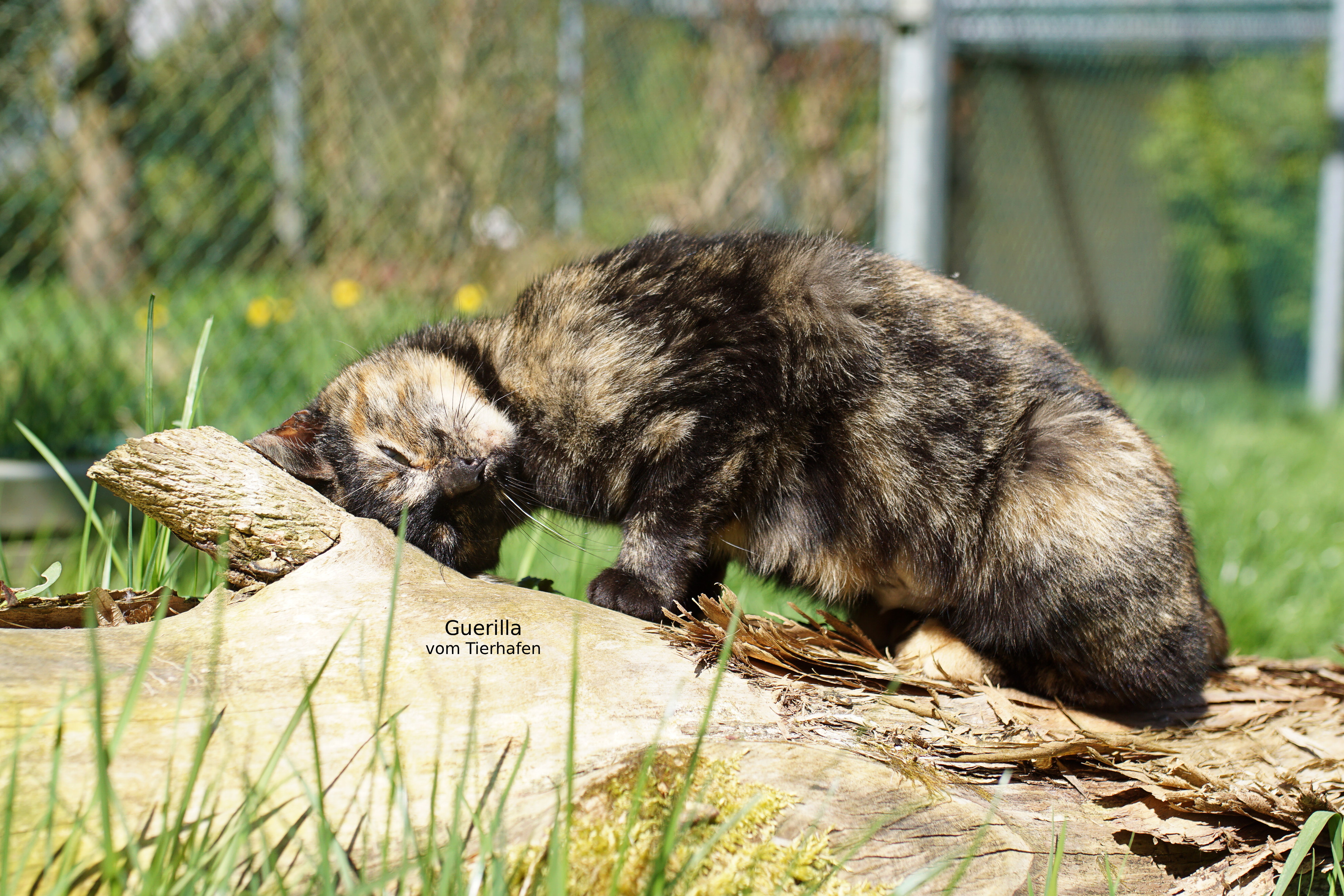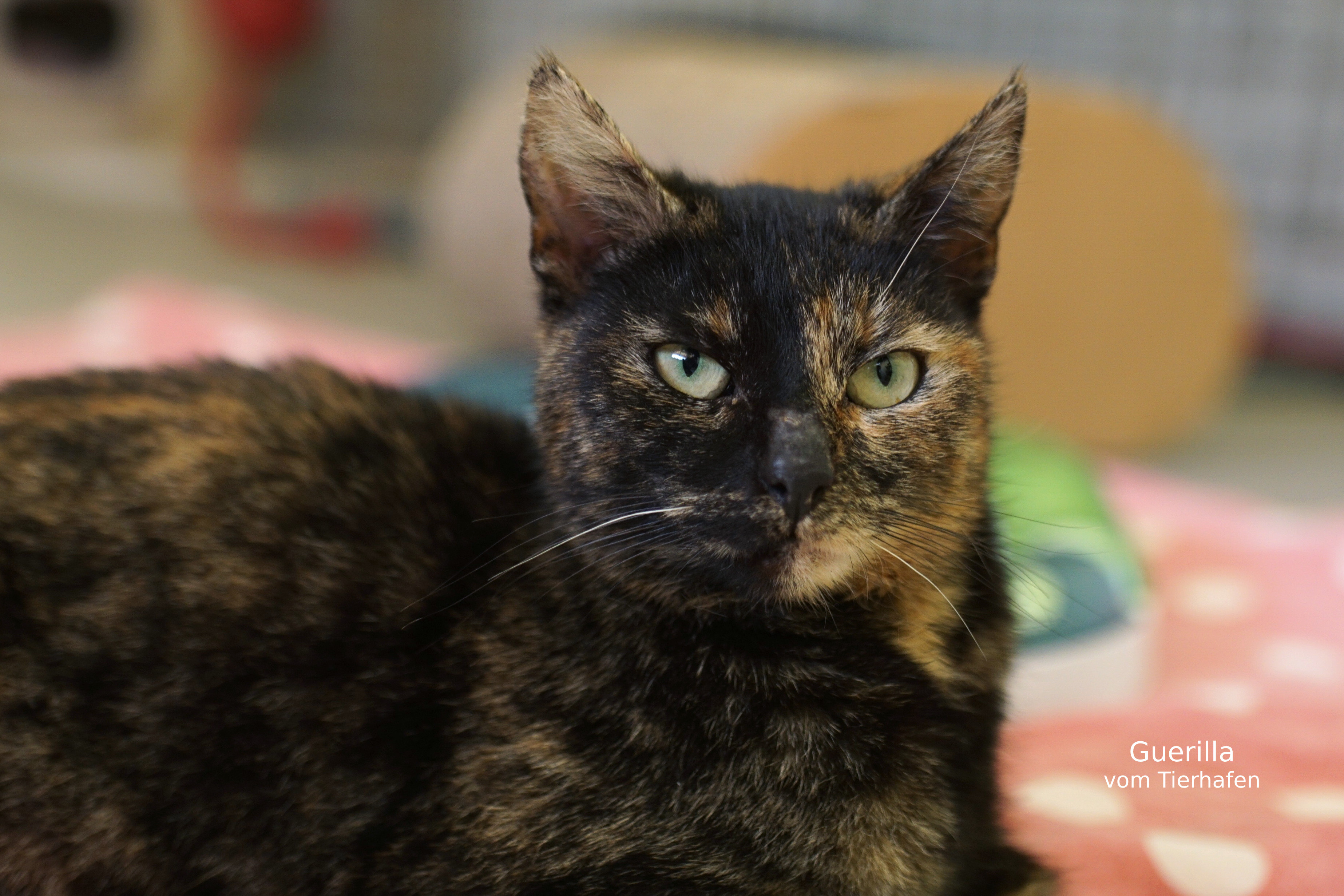 Und hier sitzt sie jetzt und möchte ganz dringend, dass wir Werbung für sie machen, denn so nett sie uns und unser Futterangebot auch findet, so werden wir ihrem Drang nach Aufmerksamkeit doch nicht einmal ansatzweise gerecht. Guerilla ist aufgeschlossen und prinzipiell sehr nett, zumindest aber im Tierheim steht sie dermaßen unter Strom, dass ihre Handlungen manchmal etwas überrumpelnd wirken. Sie liebt es geschmust zu werden, wirft sich dafür auch gern auf den Rücken, schmiegt sich eng an und schmeißt den Motor an. Mit lautem Maunzen und Im-Weg-Stehen macht sie sich bemerkbar und ist in Windeseile zur Stelle, wenn man sie ruft.
